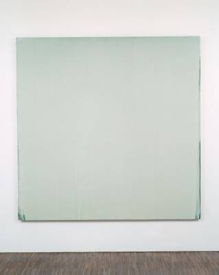 Paint is applied to the canvas after it has been stretched and hung. The paint flows from top to bottom making visible its liquidity an the dictates of gravity, as it congeals into a unified skin of color. The flow is regulated by a roller on a pole that becomes an extension of the artist’s body an permits a direct transference of the medium from one figure to another. The more personal markings of a hand-held brush would provide information that would interrupt the sensation of the plane of color. Just enough layers (usually three or four) are applied in rows of flows to fully establish the color. Neither surface nor process are permitted to call undue attention to themselves. All is balanced. Rigor, restraint, and clarity mark Marioni’s work.